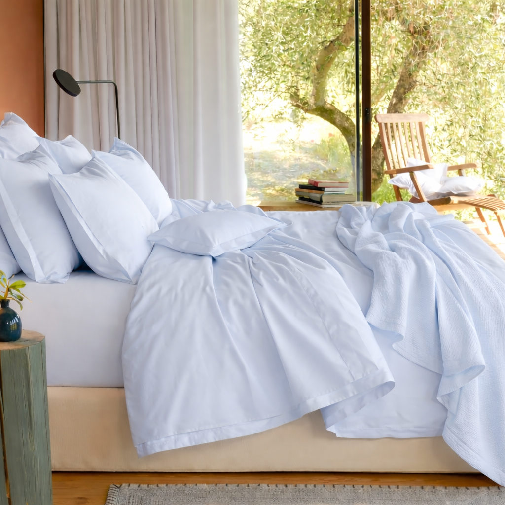 Seprai Fresco dengan 400 Thread Counts termasuk kualitas percale yang sangat halus. Kain ini dibuat dari kapas Giza murni dengan serat ekstra panjang – ringan, lembut saat jatuh, dan memiliki sentuhan soft crisp yang nyaman. Fresco diproduksi di sebuah atelier di Guimarães, salah satu daerah tekstil berkualitas tinggi di Portugal.
