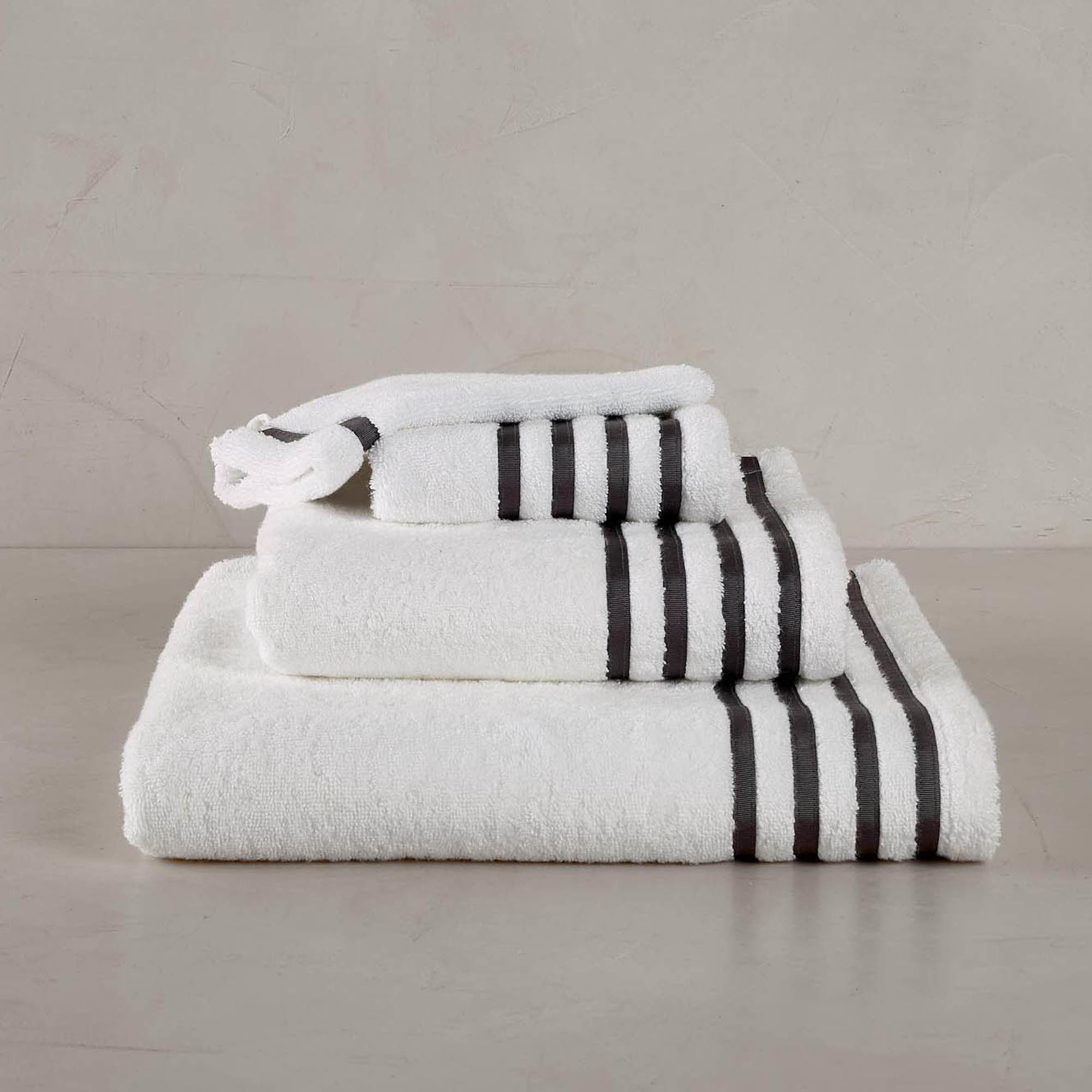 Die Frottierserie "Corvus" ist ein voluminöses, flauschiges Frottier aus ägyptischer Baumwolle. Das schwere 600g/m2 Frottier ist sagstark und weich. Auf frischem weiß wird am unteren Rand ein schwarzes Satinband in 4 Reihen aufgesetzt, was dem Tuch einen eleganten Look gibt. Auf Anfrage ist das Tuch auch in weiteren Farbstellungen erhältlich.