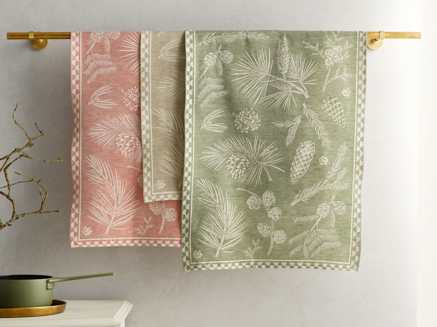 Das jacquardgewebte Küchentuch bringt die Vielfalt der Natur in den Küchenalltag. Feine Details, wie der geometrische Rahmen und die detailgetreuen Darstellungen der Gehölzzapfen, machen das Tuch zu einem dekorativen Element in Ihrer Küche.
