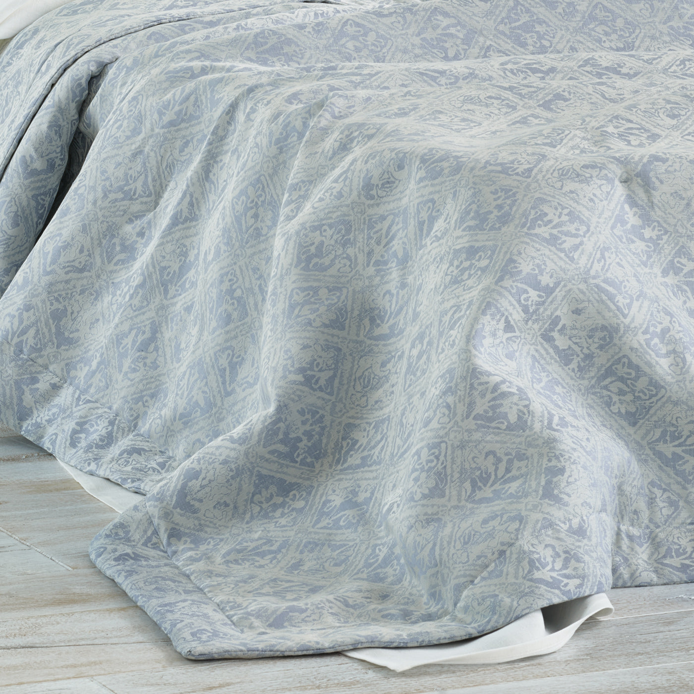 Die Tagesdecke wird durch ein rautenförmiges Muster, das an ein gemaltes Aquarell erinnert, bestimmt. Dieser "Aquarell - Effekt" wird nur durch hohe Webkunst möglich gemacht und macht aus dem Muster ein weiches, fließendes Bild. In den Rauten finden sich Skizzen von Blumen.