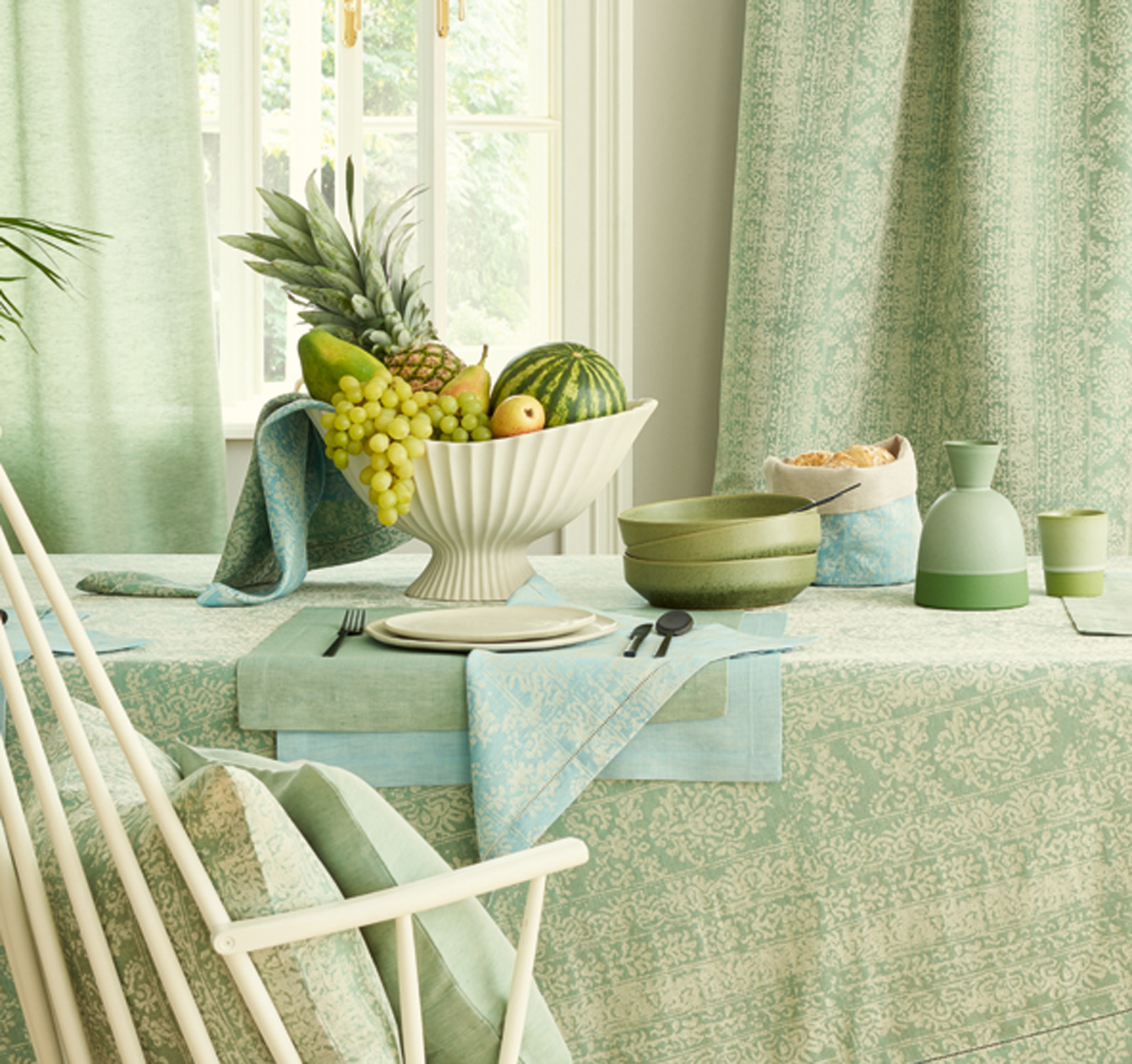 Durch die Verwendung unterschiedlicher Garnstärken kommt die Struktur des Leinens besonders schön zur Geltung. Die Garne sind im jeweiligen Farbton und im natürlichen Leinenfarbton zu einer dichten Leinwandbindung verwebt. Bei der rein weißen Variante wird nur weißes Garn verwendet.