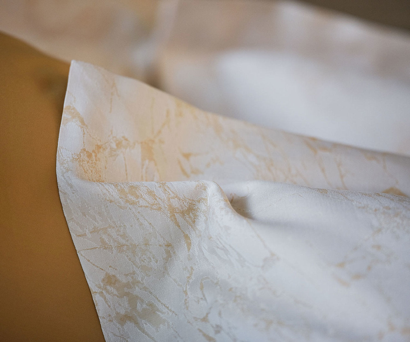 Die „Parus“ Jacquard Bettwäsche aus dem Hause Celso de Lemos vereint kunstvolle Webtechnik mit edler Farbkomposition. Fein abgestimmte Beige-, Grau- und Honig-Goldtöne ergeben ein seidig schimmerndes Gesamtbild, das an edlen Marmor erinnert. Der dreidimensionale Jacquard-Effekt verleiht der Bettwäsche Tiefe, während der leichte Glanz das luxuriöse Design unterstreicht.
