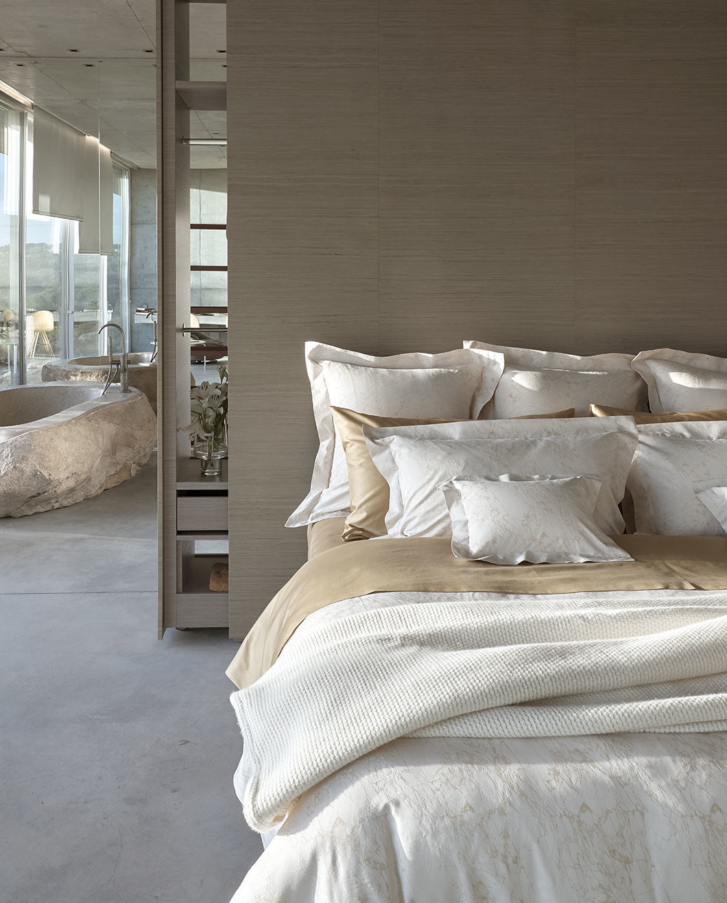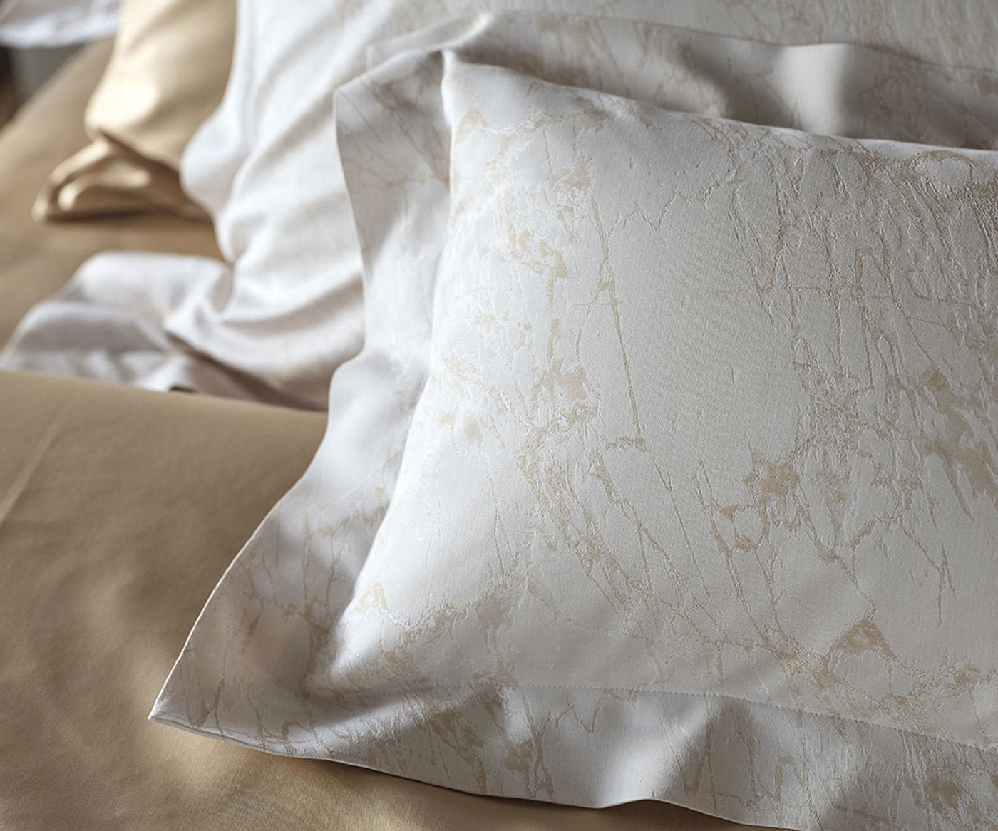 Celso de Lemos Parus – eine Bettwäsche, die mit luxuriösem Design, feinster Webkunst und außergewöhnlicher Haptik begeistert. Der marmorierte Jacquard in zarten Naturtönen bringt dezente Raffinesse und ruhige Eleganz in jedes Schlafzimmer.