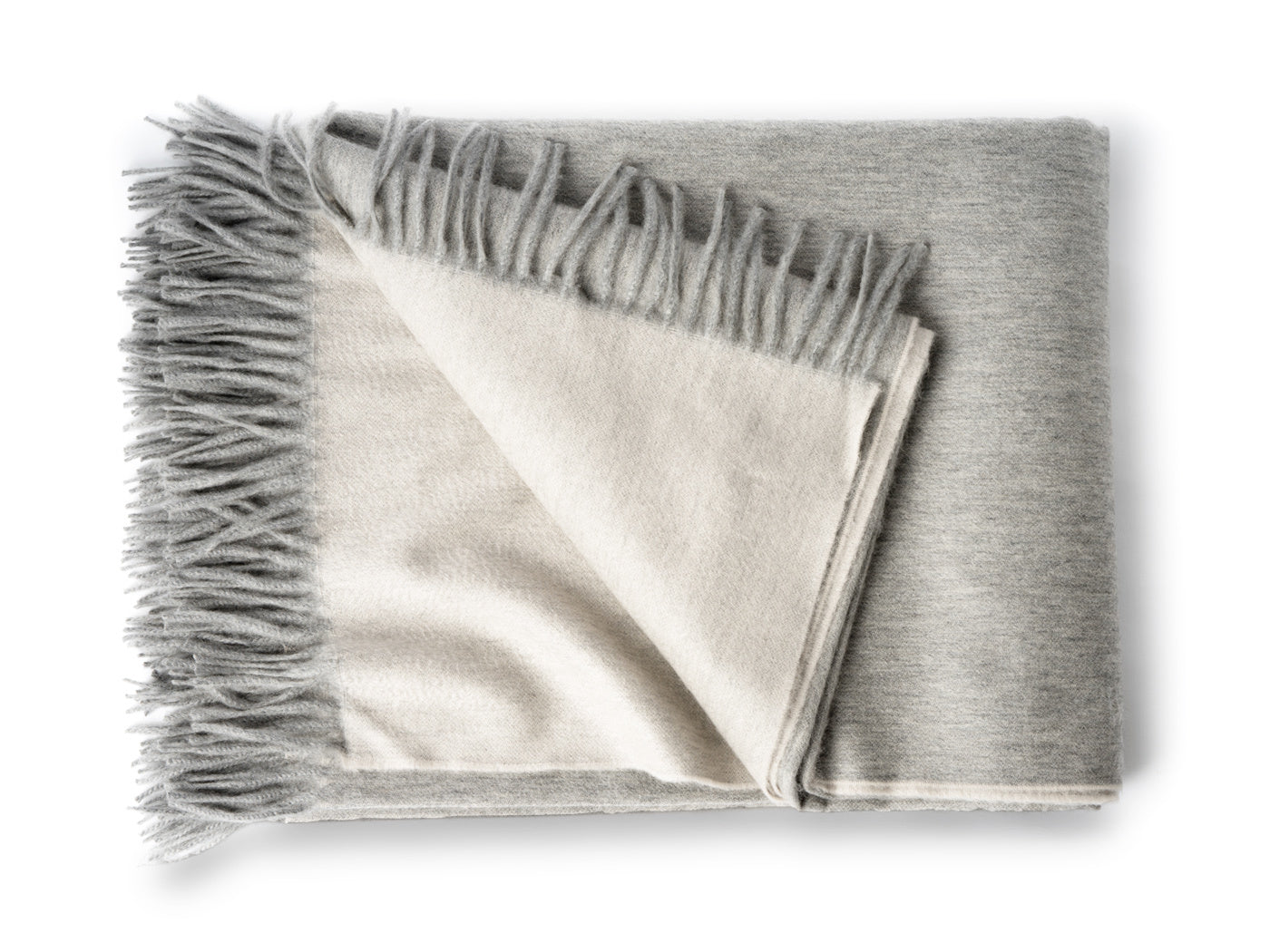 Das Wendedesign im wunderbaren Elfenbeinton und Hellgrau kombiniert mit feinen, gedrehten Fransen ist schlicht edel und gleichzeitig aufregend. Die einzigartige Verarbeitung, die kuschelig weiche Oberfläche und der unglaubliche Schimmer des Kaschmirplaids machen es zu einem traumhaft kuscheligem Luxus-Wohnaccessoire. Eine wunderbar edle, durch und durch moderne Ergänzung für Ihr gehobenes Interieur. Bei dem Kaschmirplaid „Arran“ kommt nur feinstes Kaschmir zur Verwendung. Mit einer Faserlänge von 40-60 mm und einer Faserfeinheit von 15 -16,5 Mikron zählt das hier verwendete Kaschmir zu den Spitzenqualitäten.