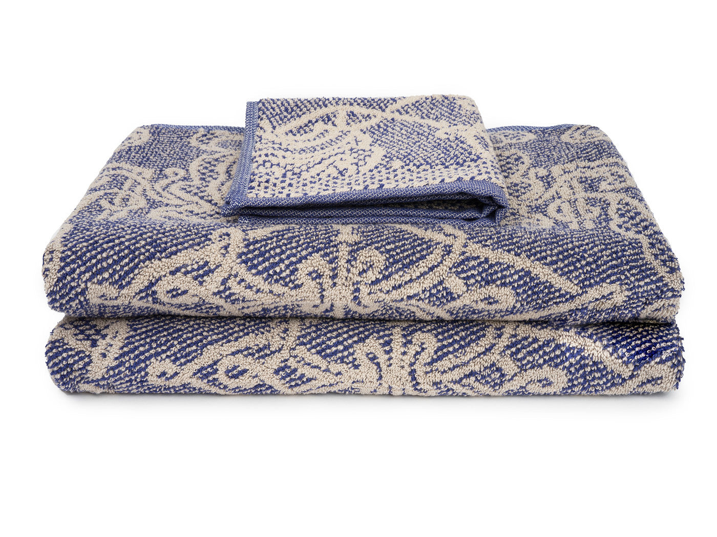 Ranken und Arabesken spiegeln den Orient und die neue Welt. Geprägt von der Renaissance bringt „Mariage“ auf eine sehr elegant, zurückhaltende Weise eine der größten Kunstepochen in Ihren Badebereich. Das ornamentale Muster liegt auf feinen, schrägverlaufenden Linien. An den Seiten wird das Handtuch mit einer dezenten Bordüre vollendet, die ein feines Karomuster bildet, welches sich aus den beiden Farben der jeweiligen Farbgebung ergibt.