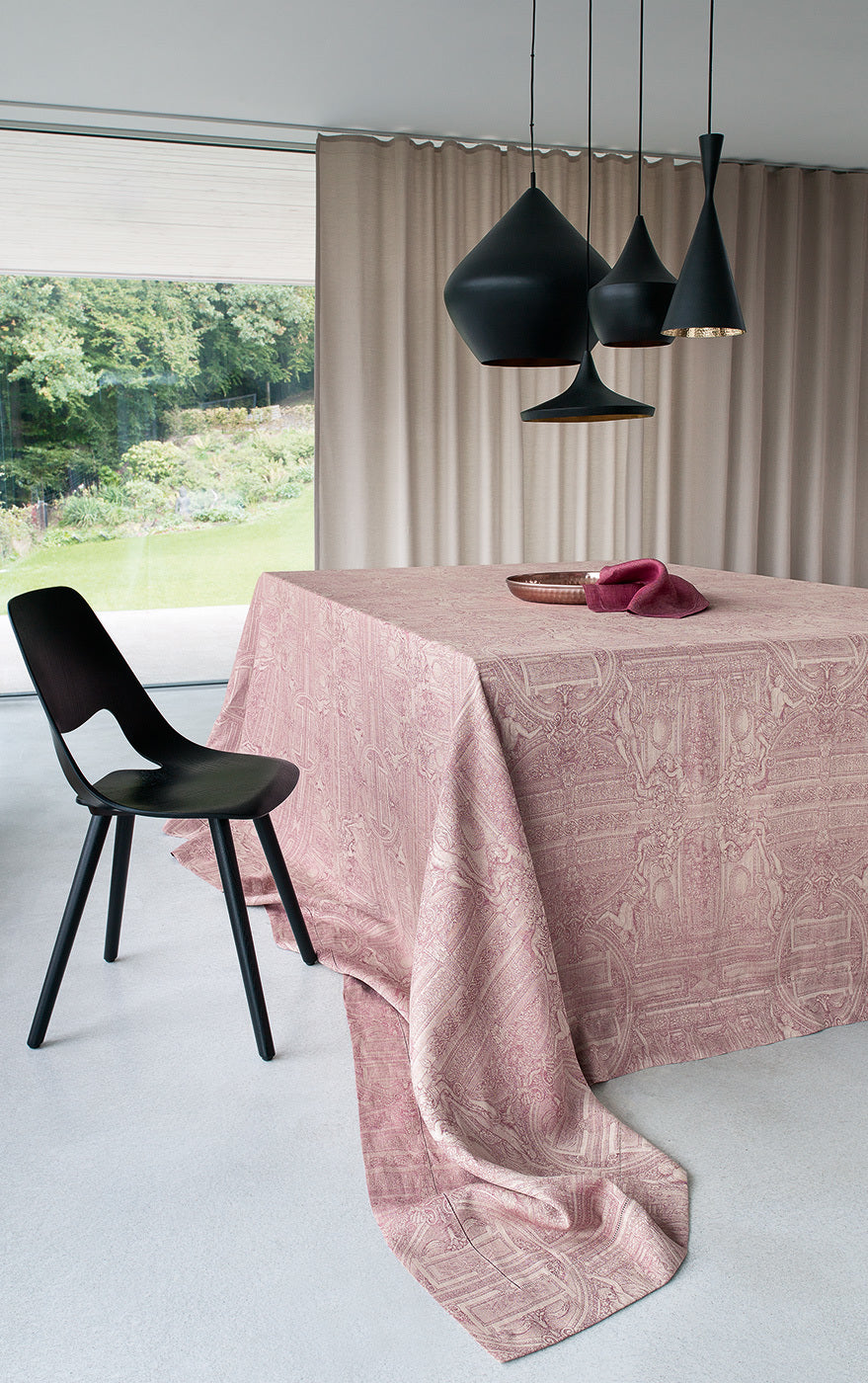 Durch Verwendung feinster Leinengarne zeigt das Jacquard Muster das Motiv aus Figuren und Architekturelementen in sehr schöner Detailstärke, bleibt aber durch die feinen Abstufungen harmonisch und dezent. Eine Tischwäsche voller Eleganz aus hochwertigem europäischem Leinen.