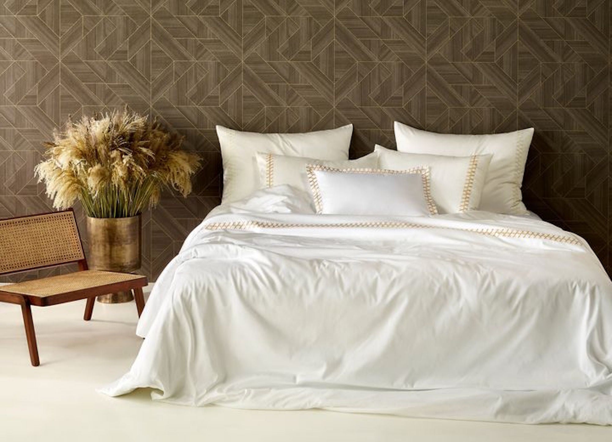 Klassische Baumwoll Satinbettwäsche aus reiner Ägyptischer Baumwolle mit einem grafischen Stick, in einer Gewebedichte von 300 Thread Counts. Durch die edle Weiß /Gold/Dunkelgrau Kombination entsteht eine elegante Bettwäsche mit einem lässigen Touch. Der Griff ist weich und der Schimmer elegant. Dieses Modell wird in Brügge ateliergefertigt.