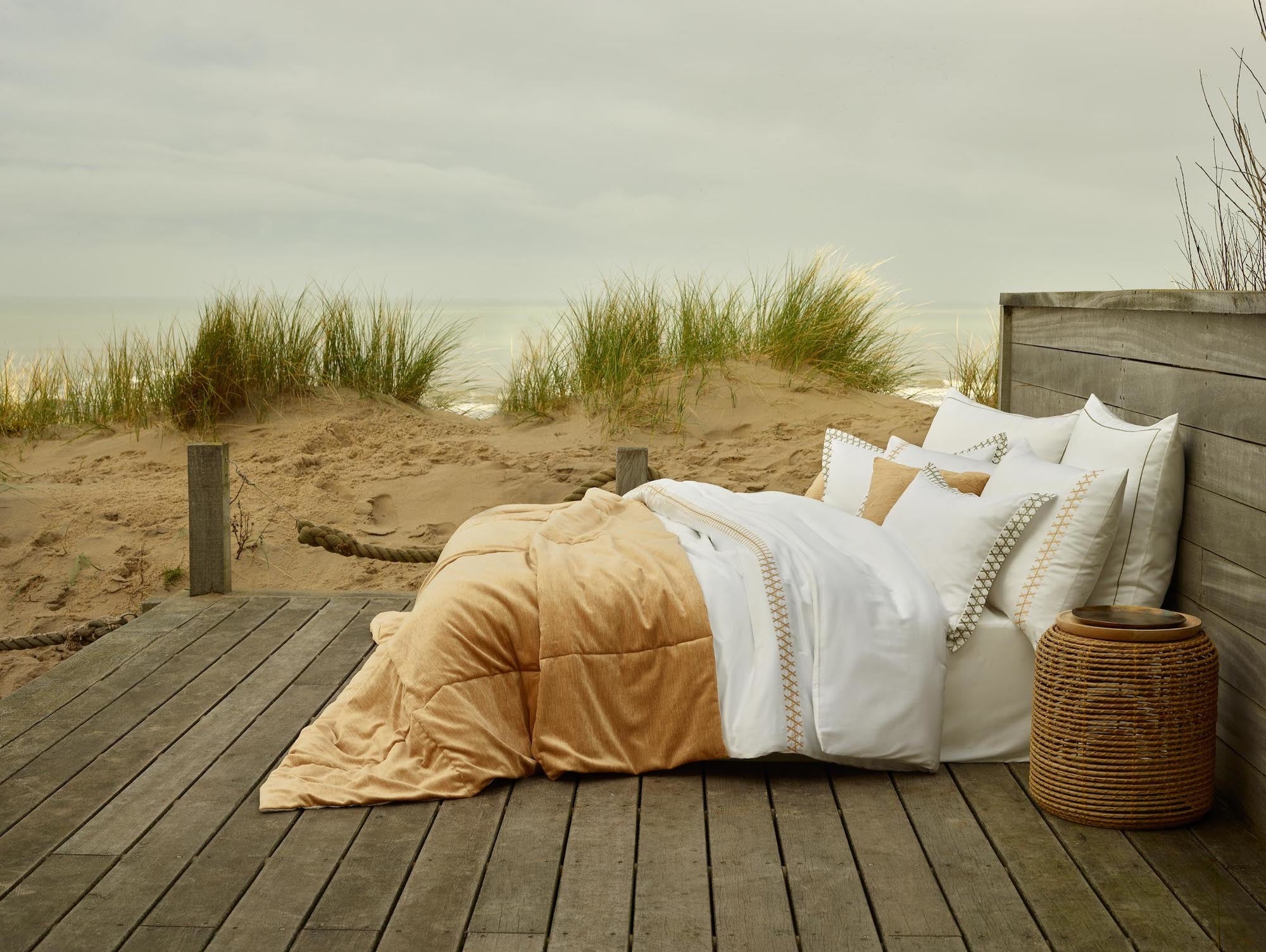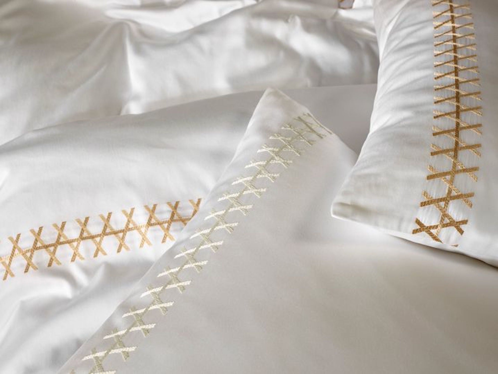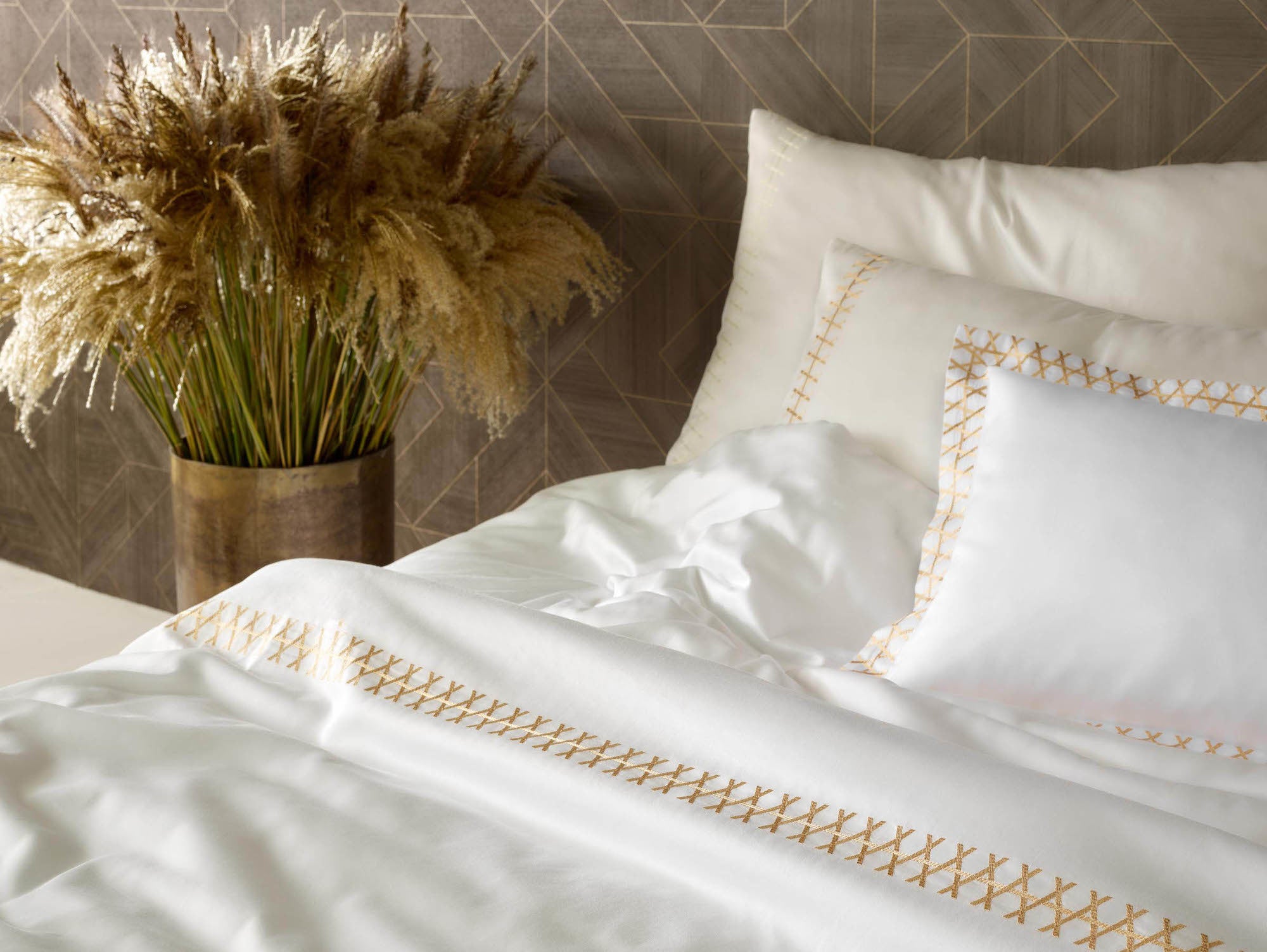 Позачасова елегантність із невимушеним акцентом: ця сатинова постільна білизна з бавовни із чистої єгипетської бавовни (прибл. 300 Thread Count) вражає м'якістю на дотик, тонким сатиновим блиском і точним графічним вишиванням. Вишукана комбінація білий/золотий/темно-сірий виглядає сучасно та стримано – ідеально для стильних спалень. Ательєйне виготовлення у Брюгге з максимальною ретельністю.